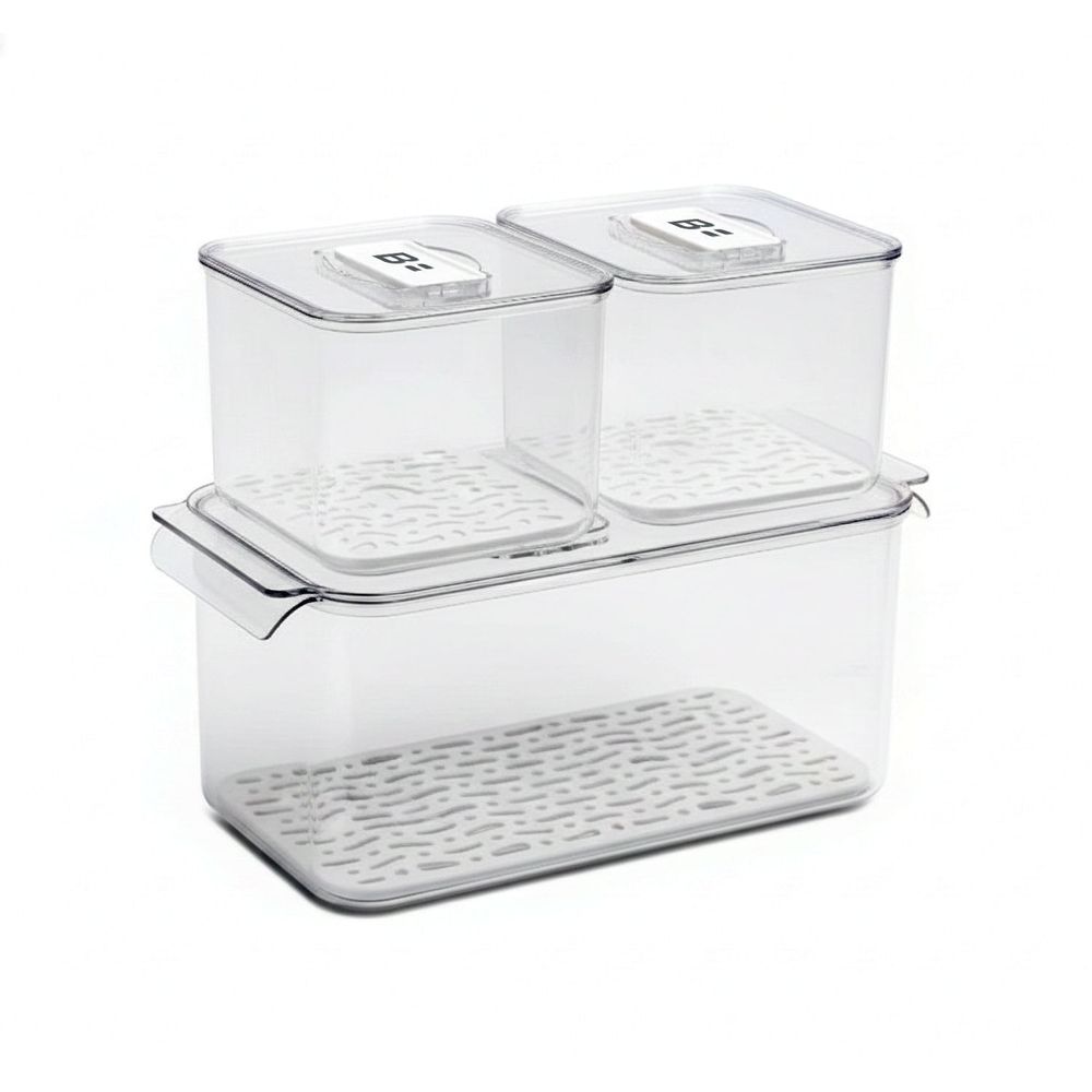 Conjunto de 3 containers para geladeira, com marcador de data, respirador, e fundo especialmente ondulado para separar a água dos alimentos. Pode ir ao Microndas - feito em AS+PP+ com anel de Silicone para isolamento. Um recipiente grande de 5700 ml e dois recipientes tamanho P de 1700 ml com tampas. O tamanho grande mede 31,5x16,3x14,5 cm, o tamanho pequeno mede 14,2x11,7 cm. Alta qualidade, feito de material PET durável de grau alimentício e 100% livre de BPA.